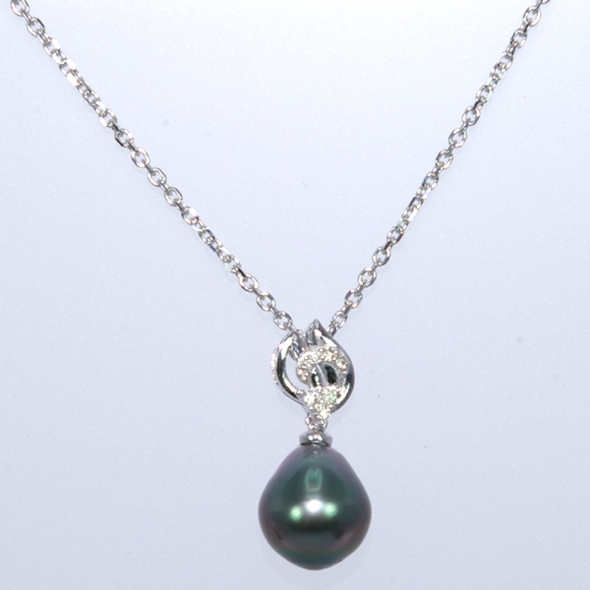 9-10mm Tahitian Pearl Drop Shape, 18K White Gold Pendant With 0.064cts TW Diamond, 45cm 18KWhite Gold Italian Chain.