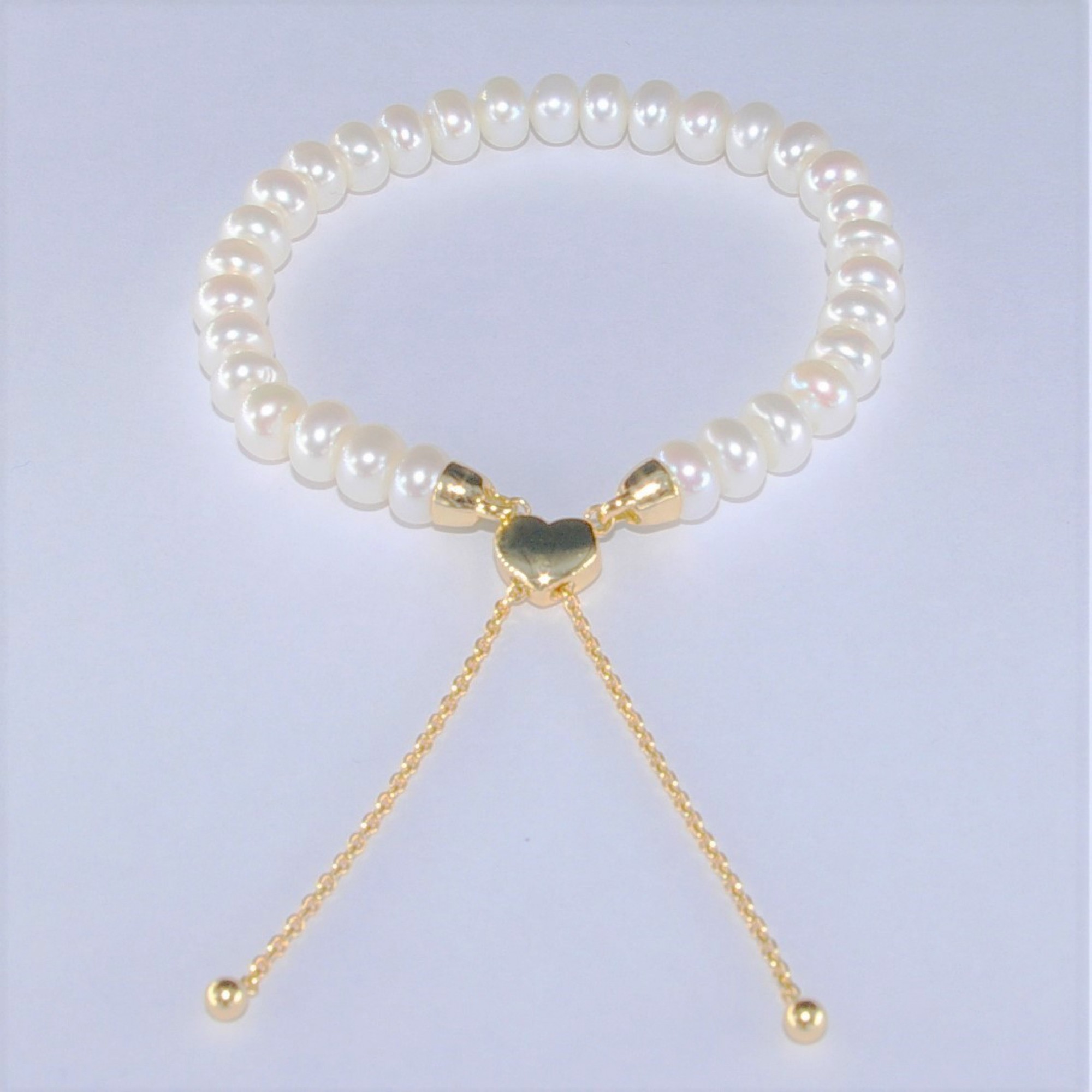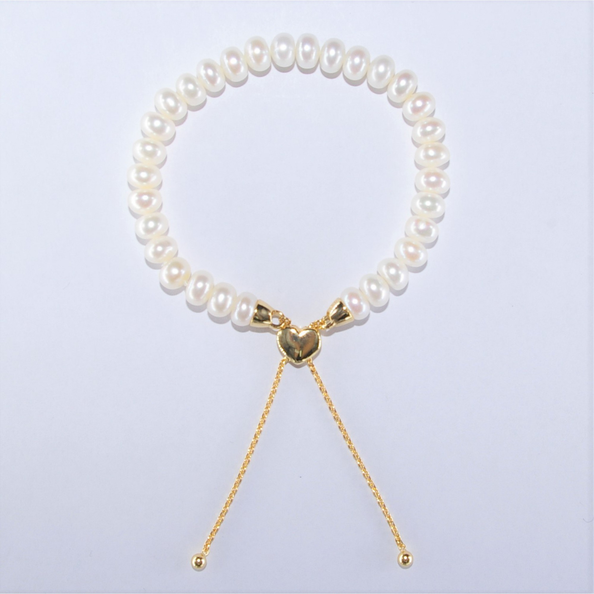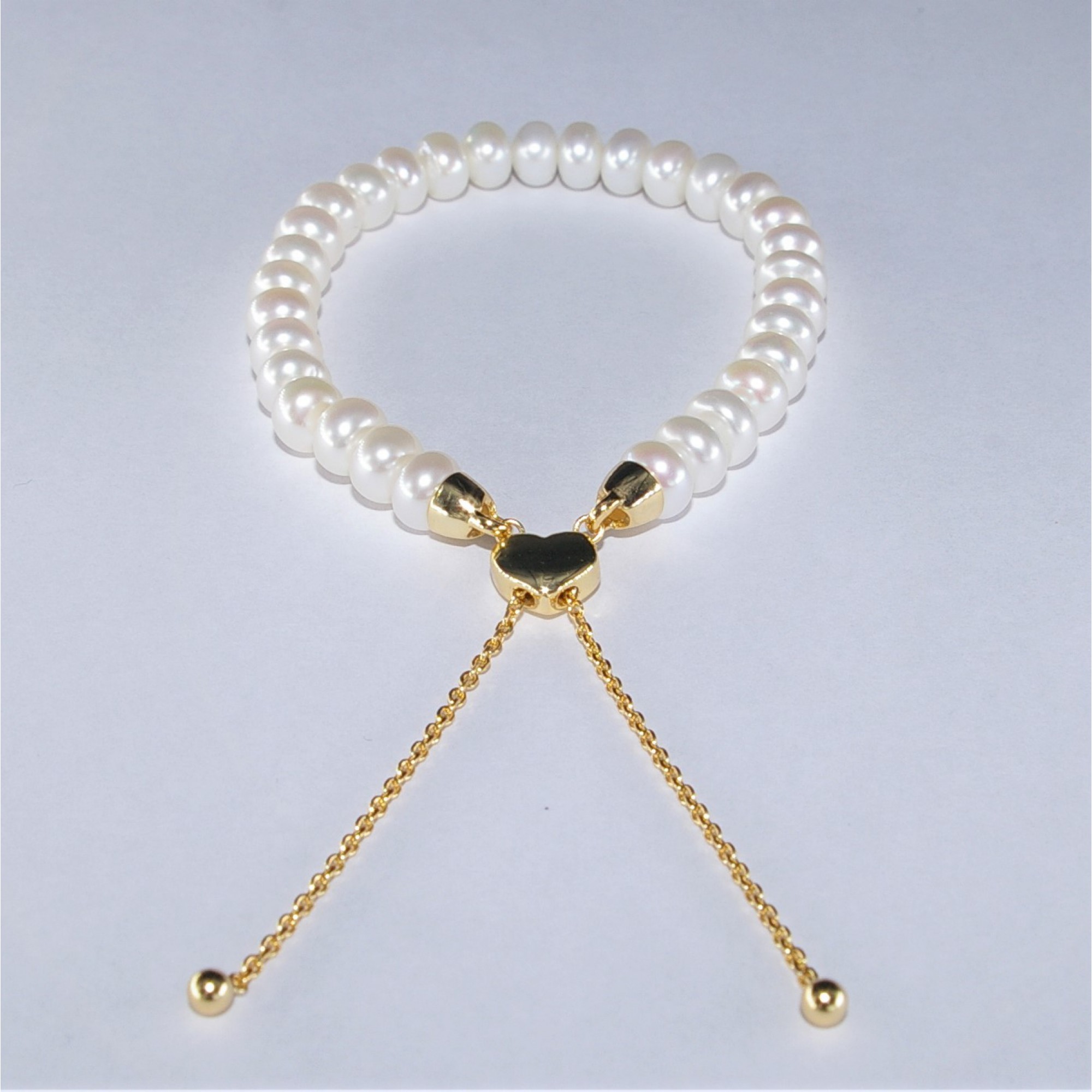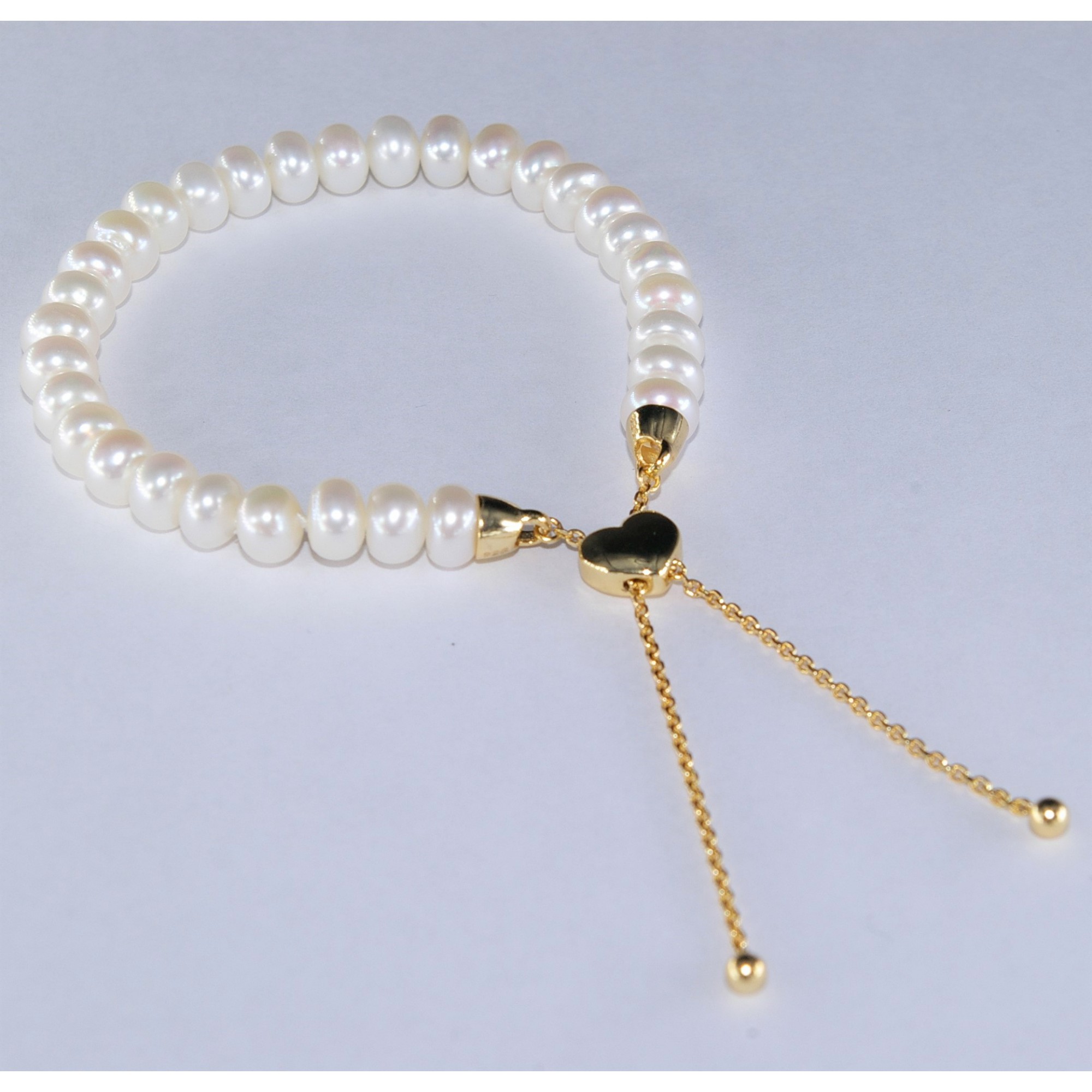 6.5-7mm Freshwater Button White Pearl Adjustable Bracelet With 925 Silver Heart Shape Clasp Gold Plated Nickel Free.