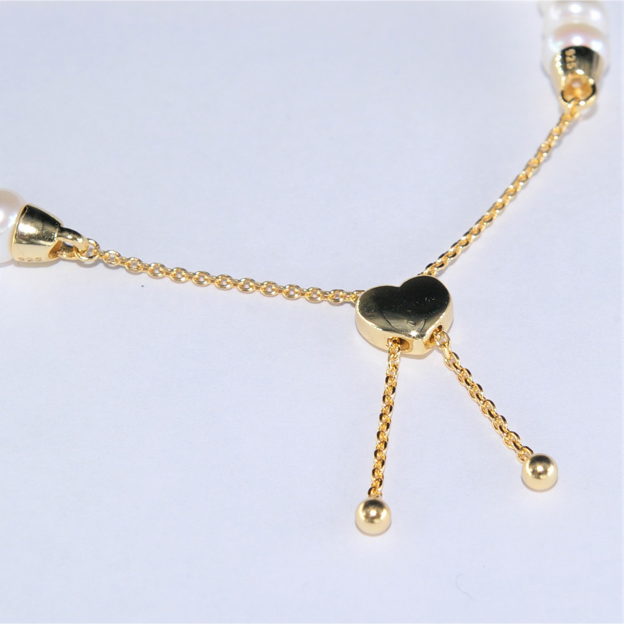 6.5-7mm白色淡水珍珠手鍊配925 銀心形扣電鍍金色, 長度可調校。
