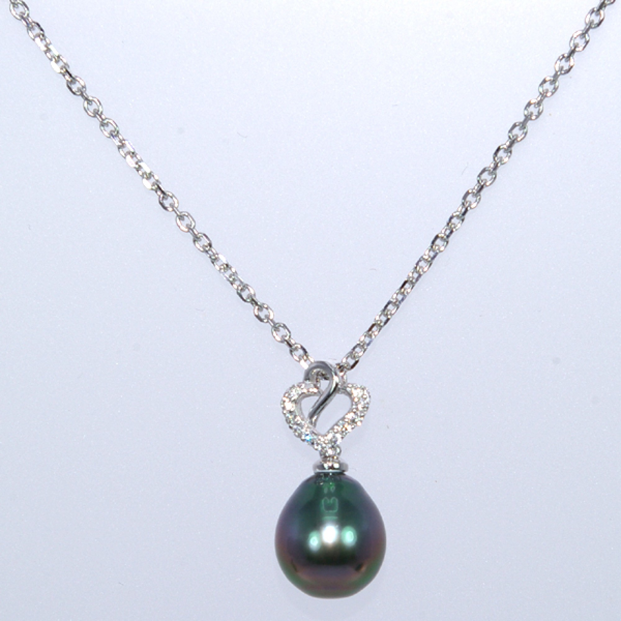 9-10mm 大溪地黑珍珠水滴18K白金鑲鑽石吊墜配18K白金意大利鍊